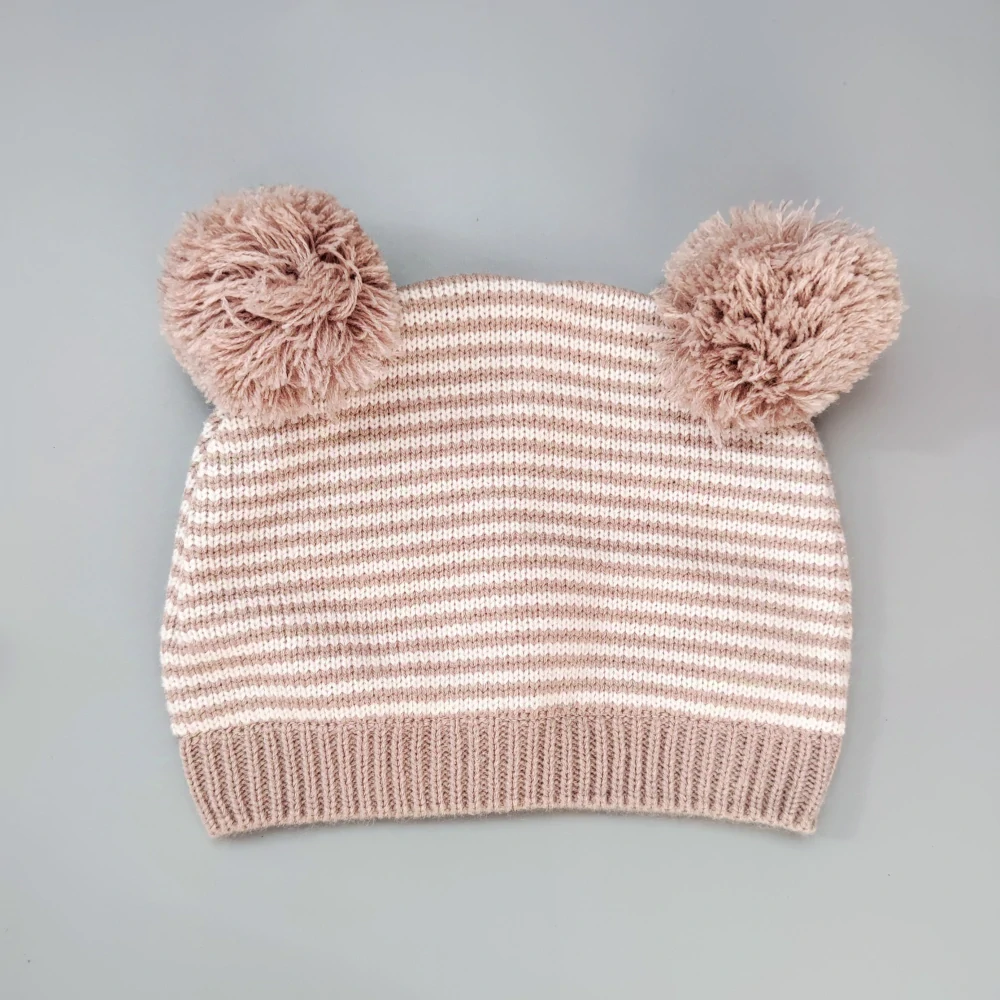 Pletená čepička Next vel. 86 béžová proužkovaná s bambulemi