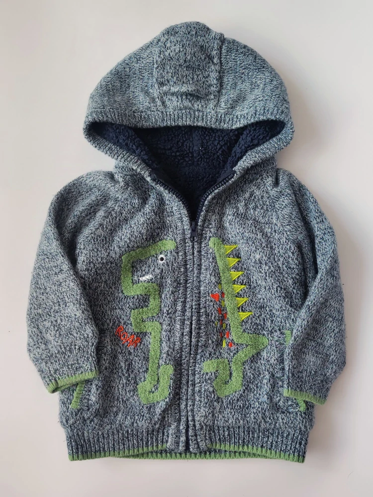 Podšitý svetr Nutmeg vel. 98 modrý dino na zip s kapucí