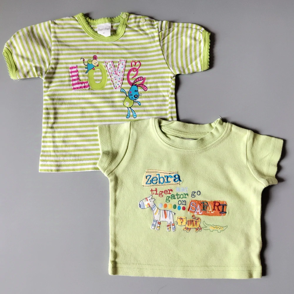 Set dvou triček vel. 62 zelené se zvířátky a pruhovanéSkladem 119 Kč
