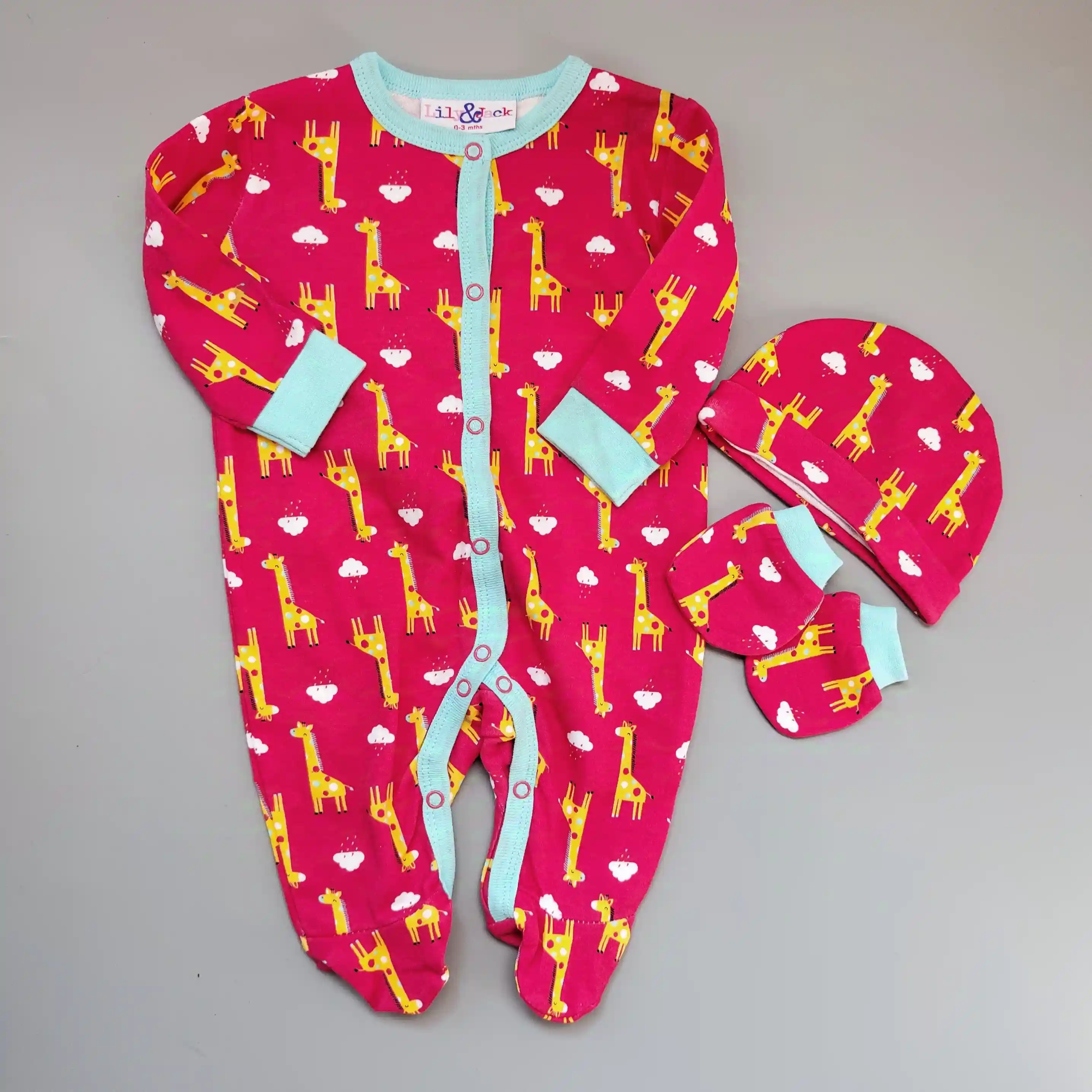 Souprava Lily & Jack vel. 62 růžový žirafový overal s čepičkou a rukavičkamiSkladem 1119 Kč