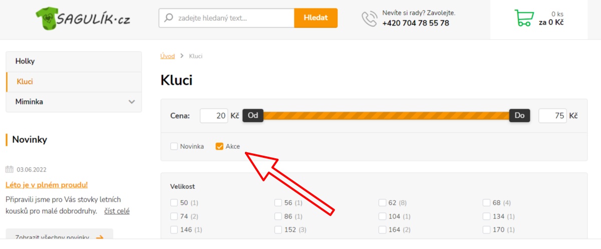 Jak si přehledně zobrazit akční nabídku? Vyberte si kategorii (Holky, Kluci nebo Miminka do dvou let) a hned nahoře se Vám zobrazí možnost filtrovat zboží dle typu: Novinky nebo Akce (viz obrázek). Pod obrázkem najdete rovnou odkazy na akční oblečky. Tak hurá do toho!