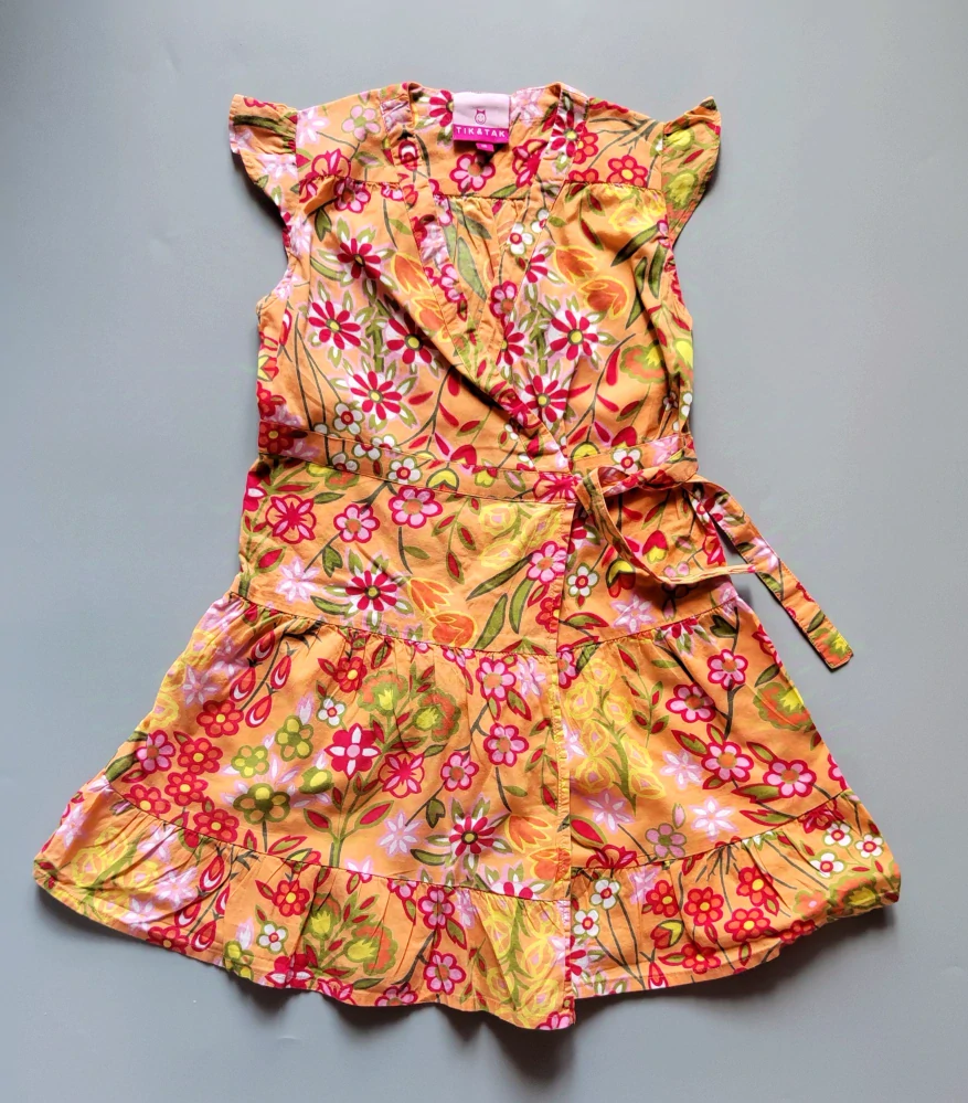 Zavinovací plátěné šaty Tik & Tak vel. 110 oranžové s květy