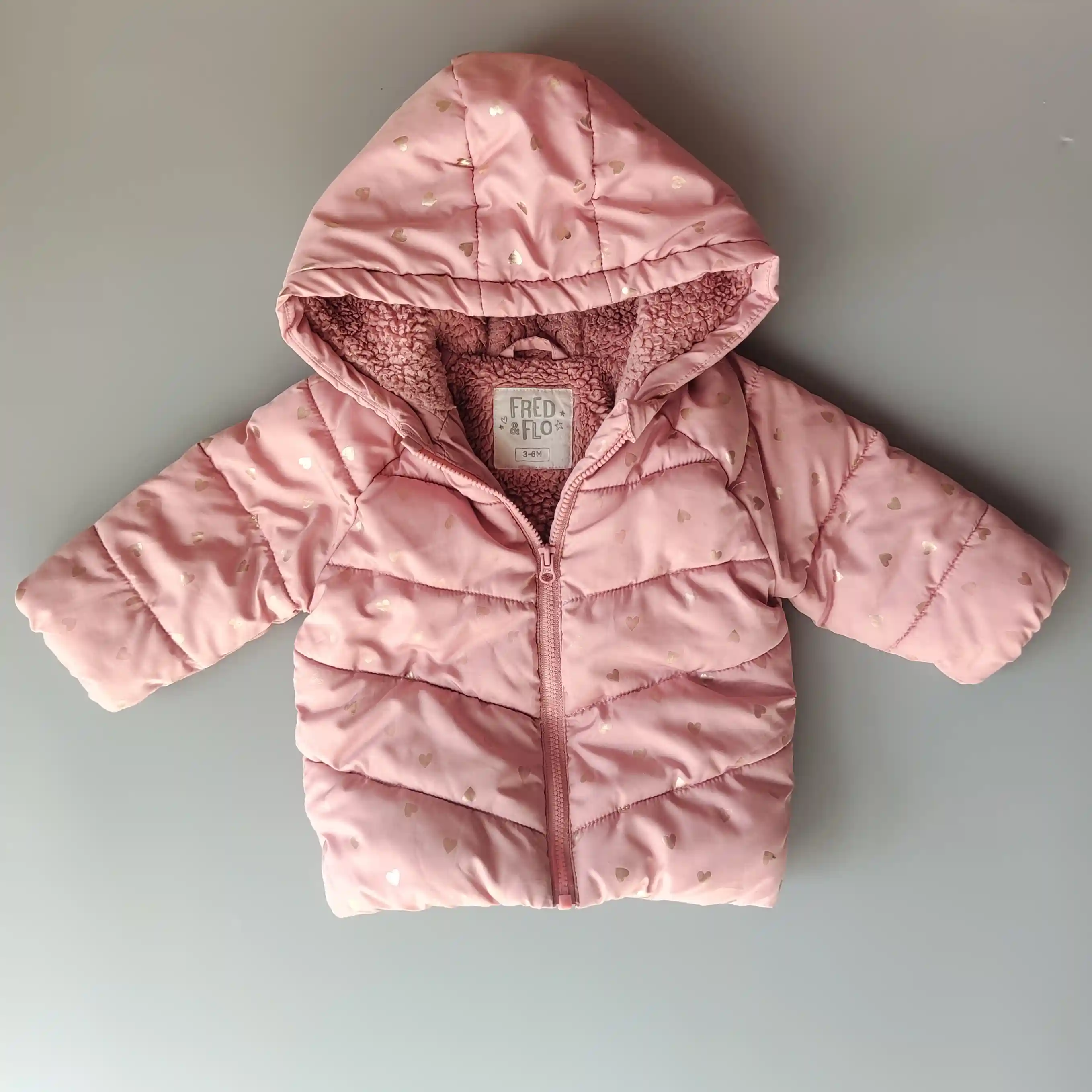Teplá plyšová podšívka, v rukávech šusťák. Téměř jako nová, některá srdíčky malinko bledší barvy a jemné žmolky na okraji podšívky.